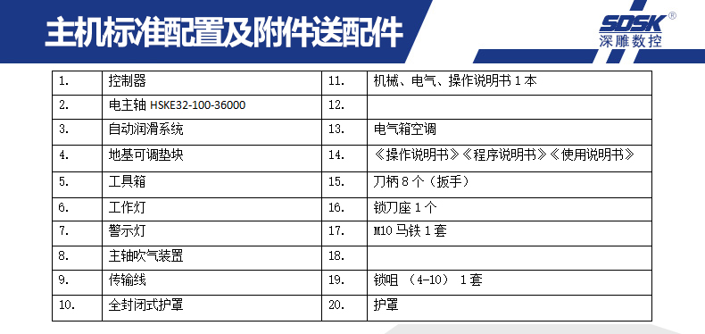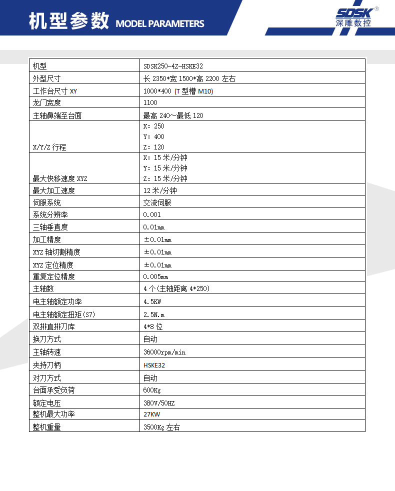 1、SDSK250-4Z-HSKE32機型是專門為客戶量身定做的四頭精雕機; 配雙排直排8位刀庫;運動方式為Y軸工作臺前后移動,X軸左右移動,Z軸上下移動。